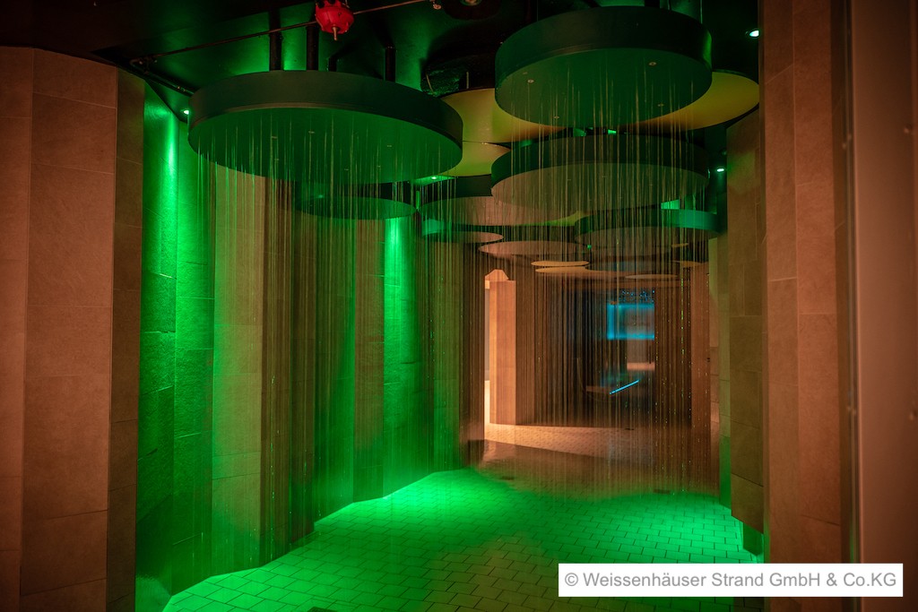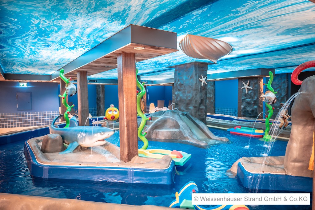 Eine weitere Deutschlandpremiere ist die Water World, eine riesige Wasserspiellandschaft, die ihre Besucher auf über 400 Quadratmeter Grundfläche zum Spiel mit dem Wasser lockt. Regenwalddusche, Textilsauna, Dampfbad und die exklusiven Mietkabinen in Form von Muscheln komplettieren das Angebot des Badeabenteuers.