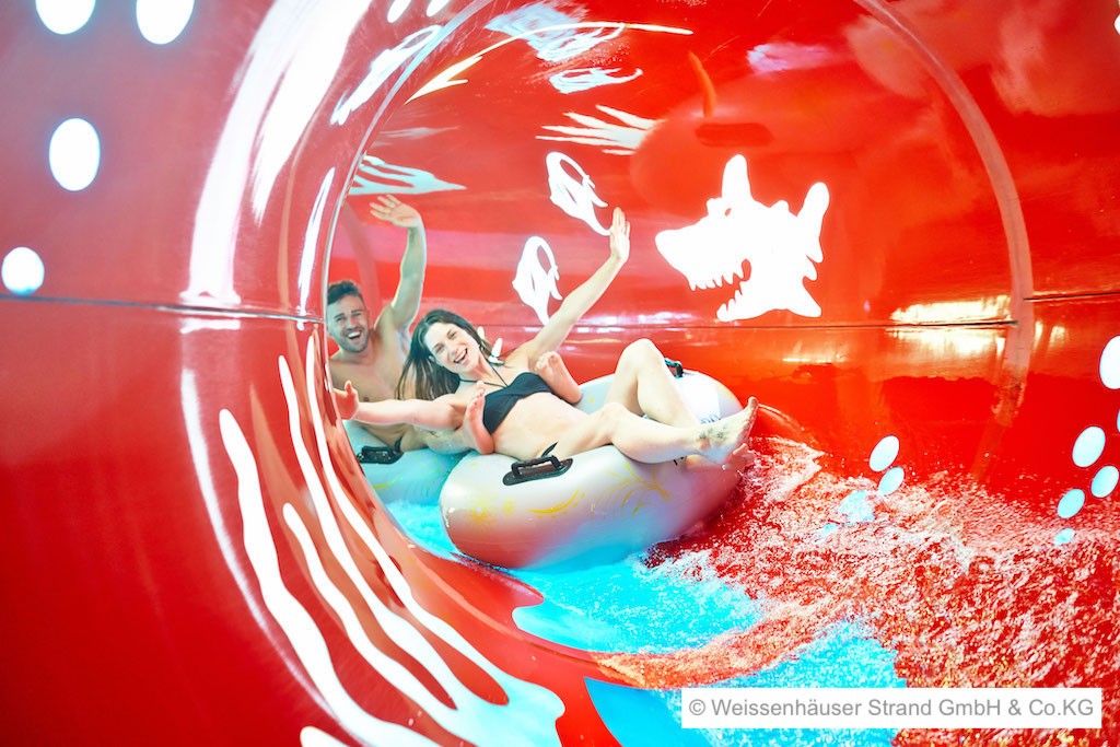 Eine der beliebtesten Attraktionen des Subtropischen Badeparadieses am Weissenhäuser Strand ist die Wasserrutschenwelt: Der 214 Meter lange Aqua Racer zählt zur neuesten Rutschengeneration auf Reifen und weist eine zweiläufige Startbox auf. Ob mit Einzel- oder Doppelreifen, ob hintereinander her oder nebeneinander um die Wette, es ist auf alle Fälle die Formel 1 des Rutschvergnügens. Die dreispurige Wellenrutsche lädt die auf einer Länge von 35 Metern zum Wettrutschen ein. Beim Nutzen der Rutschen ist es wichtig, auf die jeweiligen Altersbeschränkungen zu achten.