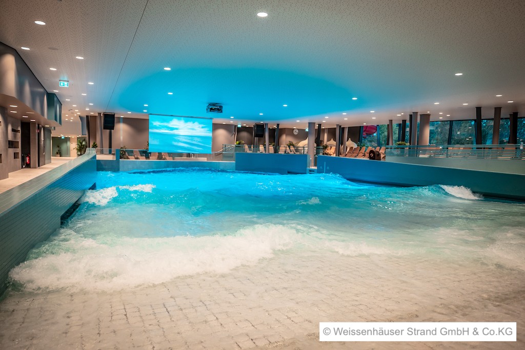 SchwimmbadVieles im Subtropischen Badeparadies ist einzigartig in Deutschland, etwa die Bauweise als Kinoschwimmbad mit mehr als 10.000 Quadratmeter Fläche. Das Wellenbad mit Kinoleinwand und mit 470.000 Liter Wasser verspricht viel Spaß mit großen oder kleinen Wellen im ganzen Jahr. Dank der ausgefeilten Technik sind die Wellen durchgängig aktiv und legen nur im Sommer in der Stunde 15 Minuten Pause ein.